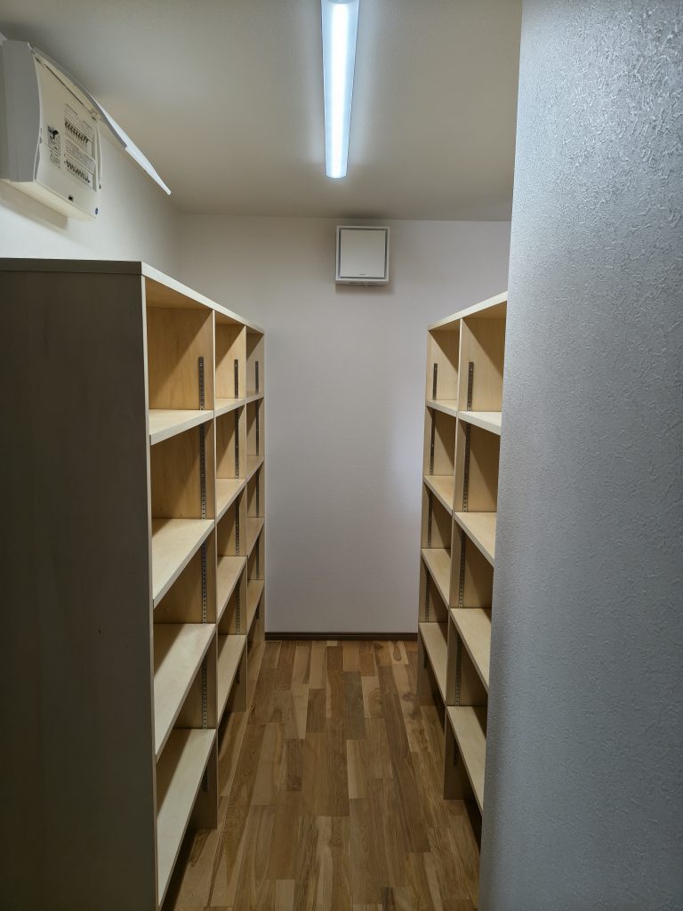 約22帖のLDKには3尺の仏壇スペースや、書斎カウンターがあります。ホールからはLDKへ、また食品庫へ行く動線があり状況に応じて選ぶことができます。上の写真、食品庫はかなりのスペースがありかなりのモノがしまえるでしょう。無垢のカバザクラの床材が、本物の木の家をより深く印象付けます。
