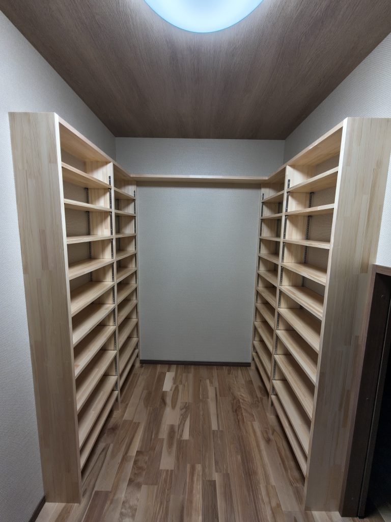 ランドリーは4帖あり、物干ししても十分なスペースがあります。物置は、CDなどが収納できる棚を設けました。
