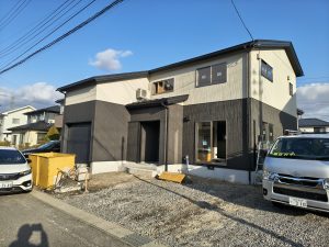 黒系×白の2トーンの外観。重くなりがちな黒の外壁を、スタイリッシュに使いこなしています。左に見えるシャッターがガレージの入り口。もちろん中で繋がっており住まいに入って行けます。車の他には自転車、除雪道具など入れる予定です。